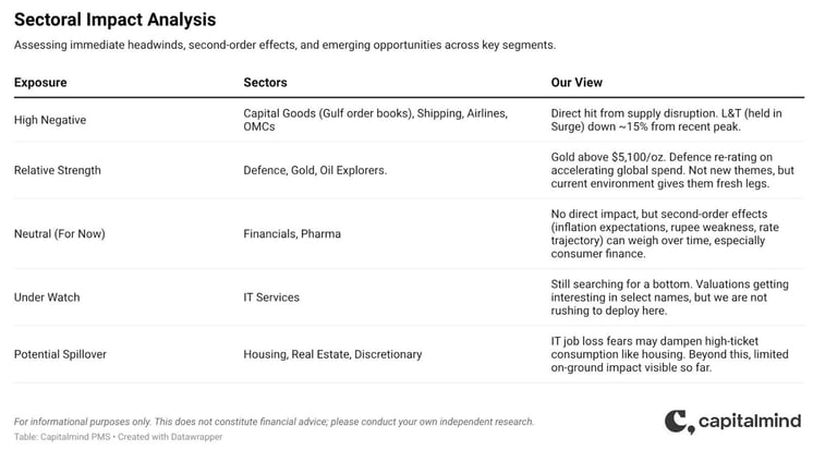 - Our cash deployment stance: After the correction, we have started deploying our cash position at 9%. But I want to be specific about why, because “be greedy when others are fearful” without reasoning behind it is just a slogan. Here’s what we are seeing: markets have historically discounted geopolitical events within 4–6 weeks (post-Gulf War 1991, post-9/11, post-Russia/Ukraine in 2022). In each case, the initial spike in crude and the corresponding equity sell-off created a window where fundamentally sound businesses traded at a meaningful discount to intrinsic value. We believe we are in that window now. The risk we are watching is duration. If Hormuz stays closed beyond 8–10 weeks, the playbook changes, and we will re-evaluate. We are not deploying aggressively. We are adding to high-conviction names where valuations have become attractive while maintaining enough cash to act further if the correction deepens.