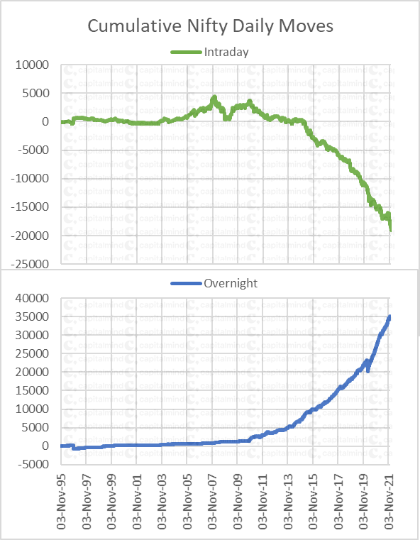 And the difference between one day’s closing price and the next day’s opening price is the “overnight” move. If we add all the “intraday” moves of the Nifty, and all the “overnight” moves separately, it turns out that nearly all the moves of the Nifty happen overnight.
