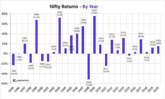The markets, of course, have an incredible story to tell. The Nifty’s up 14% for the year, the fifth consecutive positive year in succession. The market hasn’t seen this many positive years since the massive run between 2002 to 2007. And truly, this year’s amazing because we saw a drop of 35% in March, and since then, markets have come back to make new highs.
