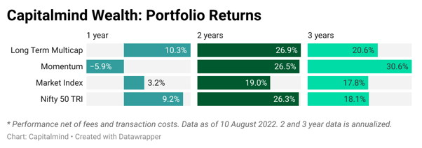 It’s been a good month in July 2022, with the markets returning about 8% at the Nifty. Our active portfolio returns have been rough in the 1 year time frame, but above in the two and three year time frames.