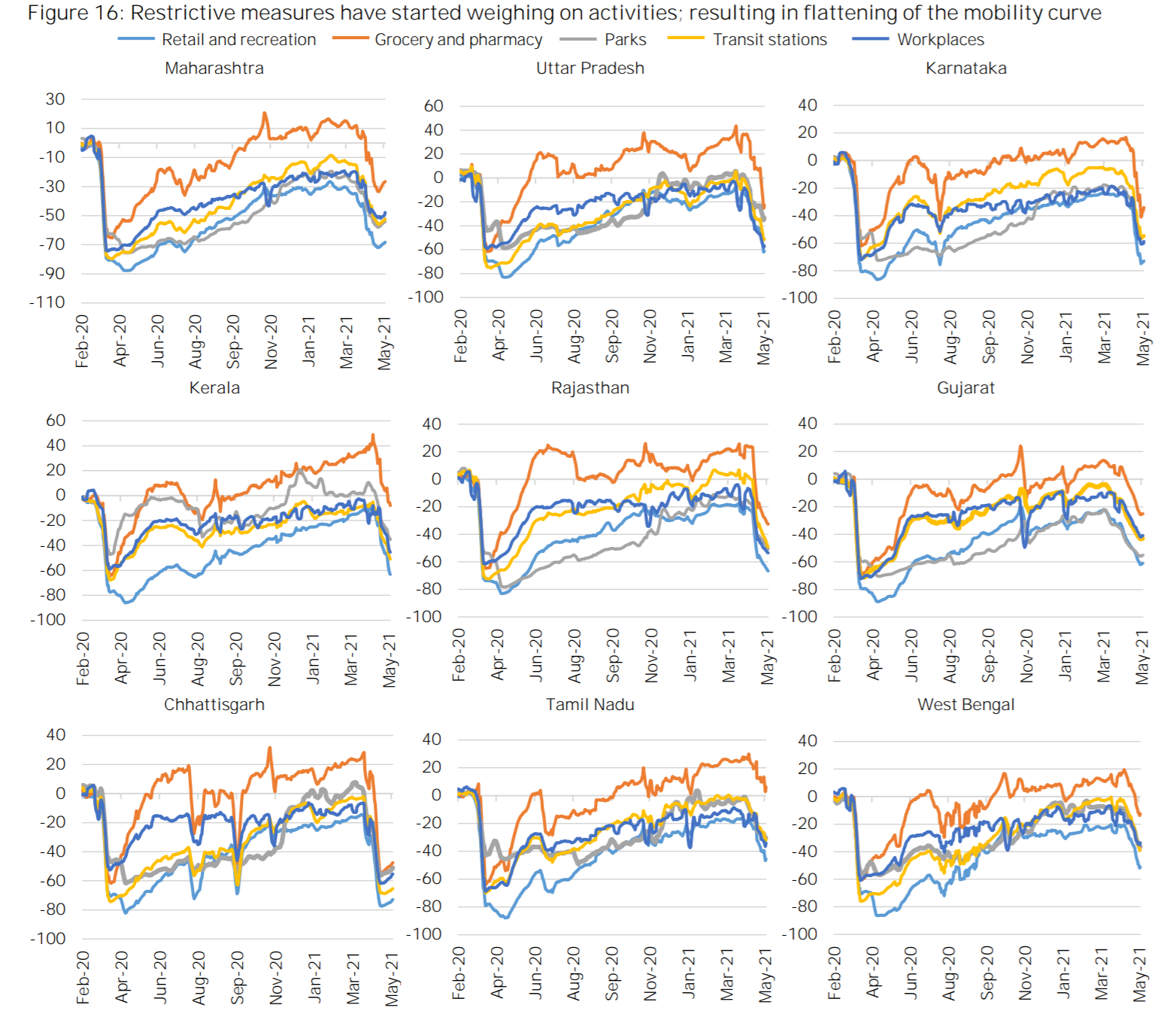 While everything went down equally in the first series of lockdowns, the fastest to recover, everywhere, was grocery and pharmacies. And even that has been hit hard in the second wave. Workplace traffic has been consistently below the Feb-20 baseline in almost all states - and has again dipped (understandably). Mobility into retail stores has been the worst hit and continues to be horribly down.