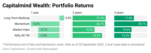Multicap has “outperformed” but a 0.8% absolute return in a year isn’t that great, honestly. Momentum and Market Index have had their rough seasons, as has the Nifty. We’ve had a lousy one year, for sure, and we are long-only so we don’t benefit from the markets falling. Longer term, we’ve delivered better returns but the true test will be to make it through this period and when equity returns get better, outperform in the short term as well.