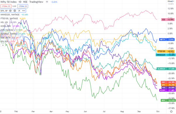- India’s seen all this before, in the last two decades. So we don’t give (too much) free money. We don’t have overloaded government balance sheets (we actually raised taxes!) and we raised our interest rates much in advance of oncoming inflation. India’s just relatively better because we healed from our scars, and everyone else is just about getting beaten up.