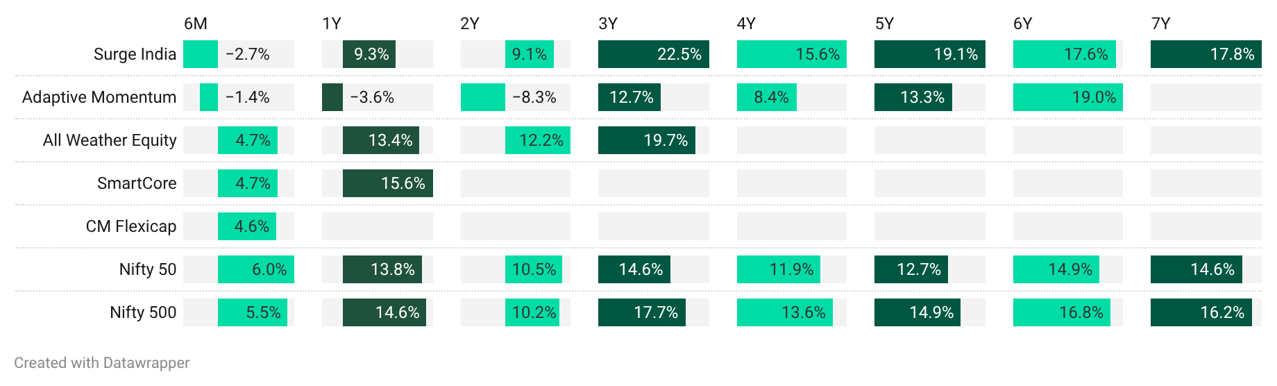 Adaptive Momentum: Looks like momentum is slowly coming back in the markets, especially in the last week. Too early to assign a trend reversal, but indeed a good sign. Investors had patiently sat through the downcycle in the last 2 years, with the expectation that if things come back, we shouldn’t be left out. The positive thing in the last week is that broader market participation is strong.