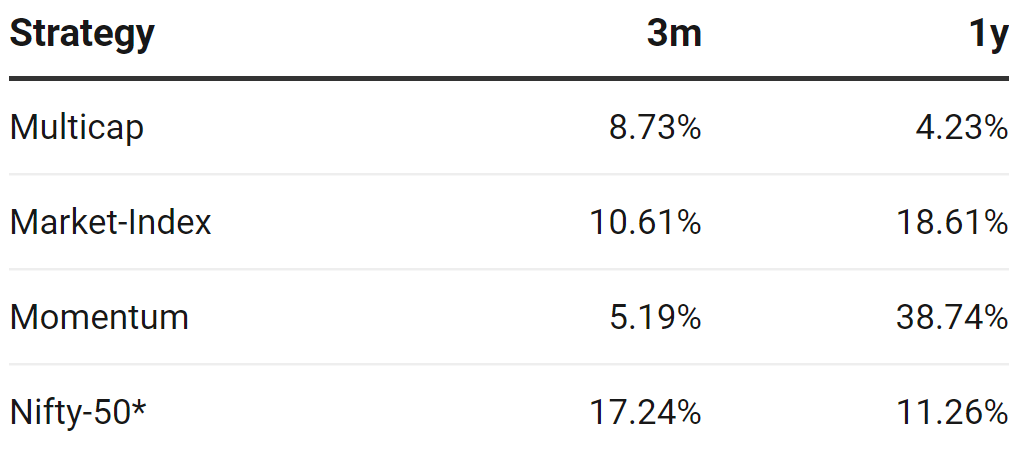 At Capitalmind Wealth, we have multiple strategies - the equity ones are Momentum, Market Index and Multicap. If you would like to rebalance between them, please let us know. Our performance in the multicap strategy has been lousy in the first two years,and that’s haunting us since. As much as we are trying to fix that, we believe it is in your best interest to diversify into the others.